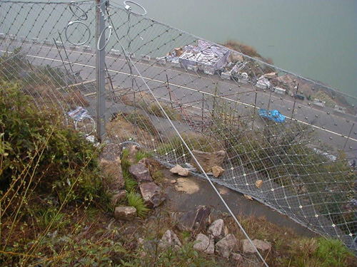被動防護網(wǎng)的柔性和攔截強度足以吸收和分散傳遞500KJ以內(nèi)的落石沖擊動能,消能環(huán)的設計和采用使系統(tǒng)的抗沖擊能力得到進一步提高SNS被動防護網(wǎng)與剛性攔截和砌漿擋墻相比較,改變了原有施工工藝,使工期和資金得到減少。